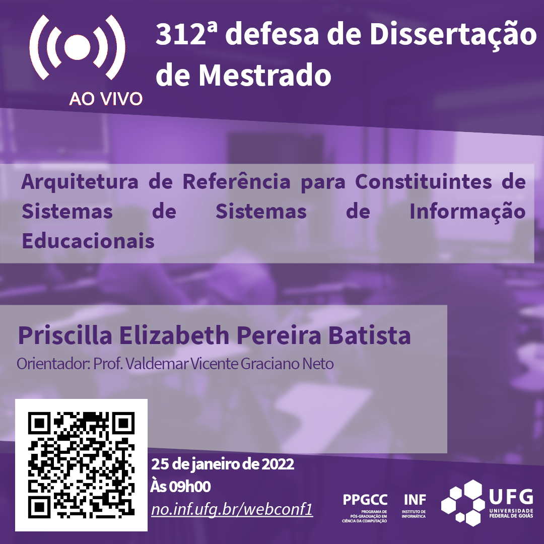 312ª Defesa de Dissertação de Mestrado - Arquitetura de Referência para Constituintes de Sistemas de Sistemas de Informação Educacionais - Priscilla Elizabeth Pereira Batista